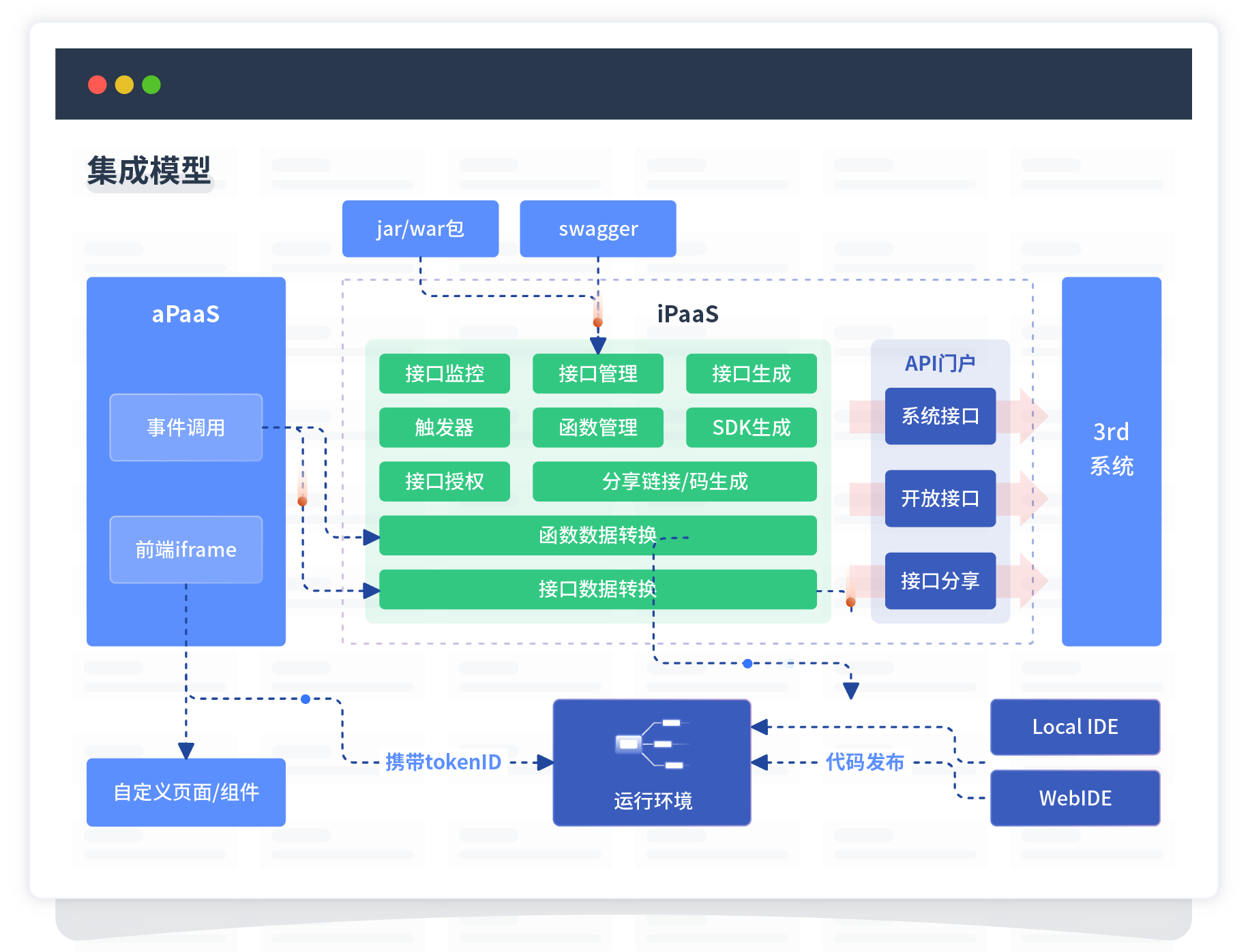 集成模型包括平台本身前、、、、、、、、、、、、、、、、后端能力的扩展,,,,,,,,,,也支持通过API门户和第三方系统进行交互。。。。。。。。。。。