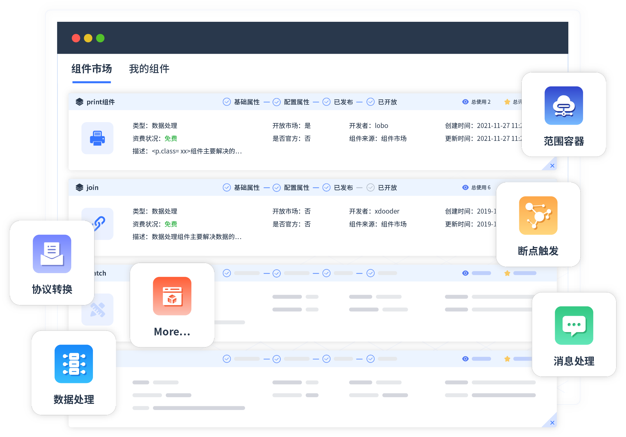 针对集成场景,,,,,,,,,小米钱包提供组件市场,,,,,,,,,例如协议转换、、、、、消息处理、、、、、、、、、、、、、、文件操作等。。。。。。。。。。。除平台提供的组件外,,,,,,,,,客户可以自定义所需组件。。。。。。。。。。。。。。
